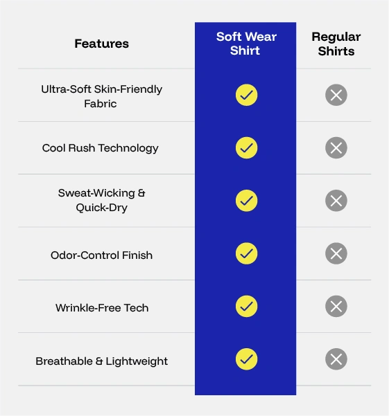 Meet the Soft Wear Shirt - office polish with performance comfort. The Cool Rush fabric feels cool the moment you touch it, while a breathable, high-recovery stretch knit moves with you from commute to closing time. Moisture is pulled off your skin and dries ultra-fast, so you stay fresh through heat and humidity. The ultra-soft, skin-friendly handfeel makes all-day wear effortless, and the wrinkle-free weave keeps the look crisp with minimal ironing. Built for real life, it’s engineered to resist fading and shrinkage, with an odor-resistant finish and soft, no-chafe seams. Pair it with office joggers or chinos - this is the shirt that works anywhere without slowing you down.